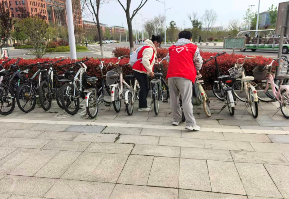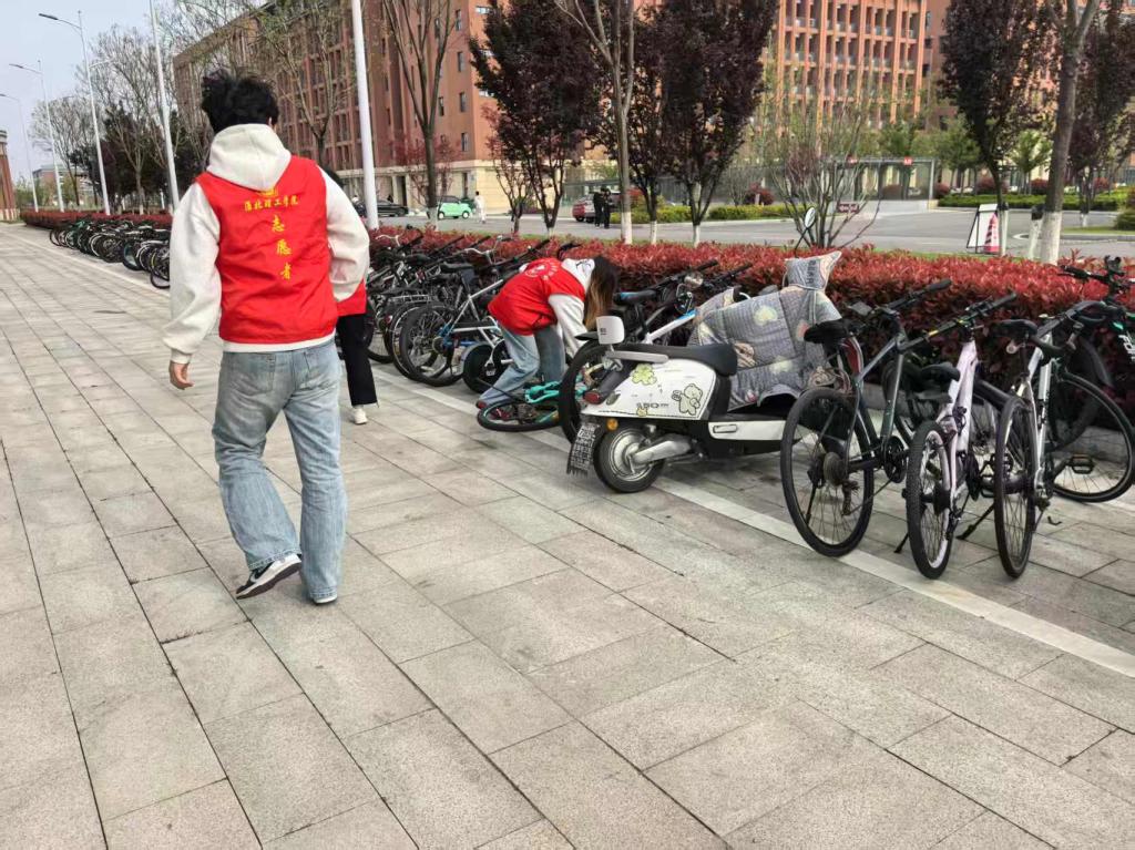活动中,志愿者们分工明确、行动迅速。大家对校园内随意停放的共享单车进行了集中整理,将歪斜、占道的车辆一一扶正、归位,摆放整齐,有效改善了校园交通秩序。同时,志愿者们手持垃圾袋,沿着校园道路、绿化带及角落,认真捡拾纸屑、果皮、塑料袋等垃圾,不放过任何一处卫生死角。