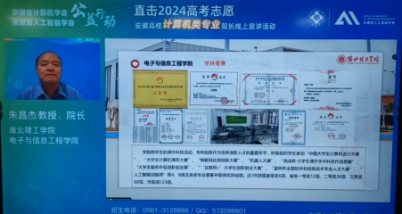 安徽省计算机学会、安徽省人工智能学会联合省内31所高校计算机学院,针对2024安徽新高考综合改革,开展了一场公益性专业招生线上宣讲活动,直播观看达4万+人次。6月27日下午17:30—18:00,我校太阳成集团tyc522cc院长朱昌杰宣讲我校计算机科学与技术、人工智能、数据科学与大数据技术、软件工程、电子信息工程、通信工程等专业招生情况。