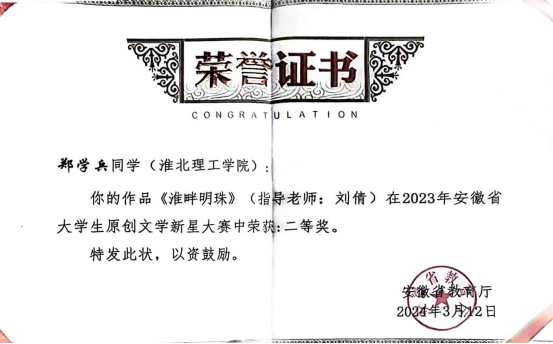 五、安徽省大学生原创文学新星大赛由安徽省教育厅主办,面向全省在校大学生的高规格、高水平学科竞赛,旨在提高大学生的语言表现能力与创作水平,推出把握时代脉搏、展现时代精神的优秀作品。本次赛事以“书写新时代,迈进新征程”为主题进行创作,创作形式包括小说、剧本、诗歌、散文等。