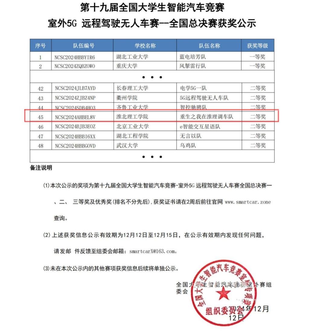 12月7日至8日,由中国自动化学会主办的第十九届全国大学生智能汽车室外赛全国总决赛在安徽工程大学开赛。我校学子在比赛中表现优异,斩获全国二等奖。这是我校组织A类赛事以来首次获得国家级奖项。