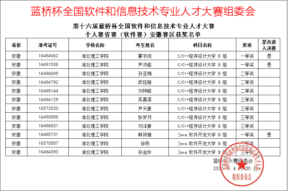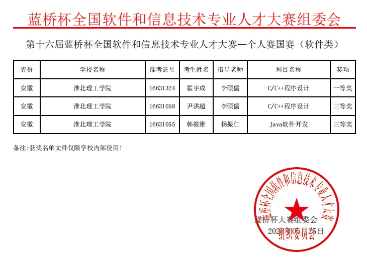 我校太阳成集团tyc522cc学子凭借扎实专业功底在第十六届“蓝桥杯”全国软件和信息技术专业人才大赛全国总决赛中,获国家一等奖1项、国家二等奖1项、国家三等奖2项;在第十六届“蓝桥杯”全国软件和信息技术专业人才大赛安徽赛区,获省级一等奖4项、省级二等奖14项、省级三等奖13项。