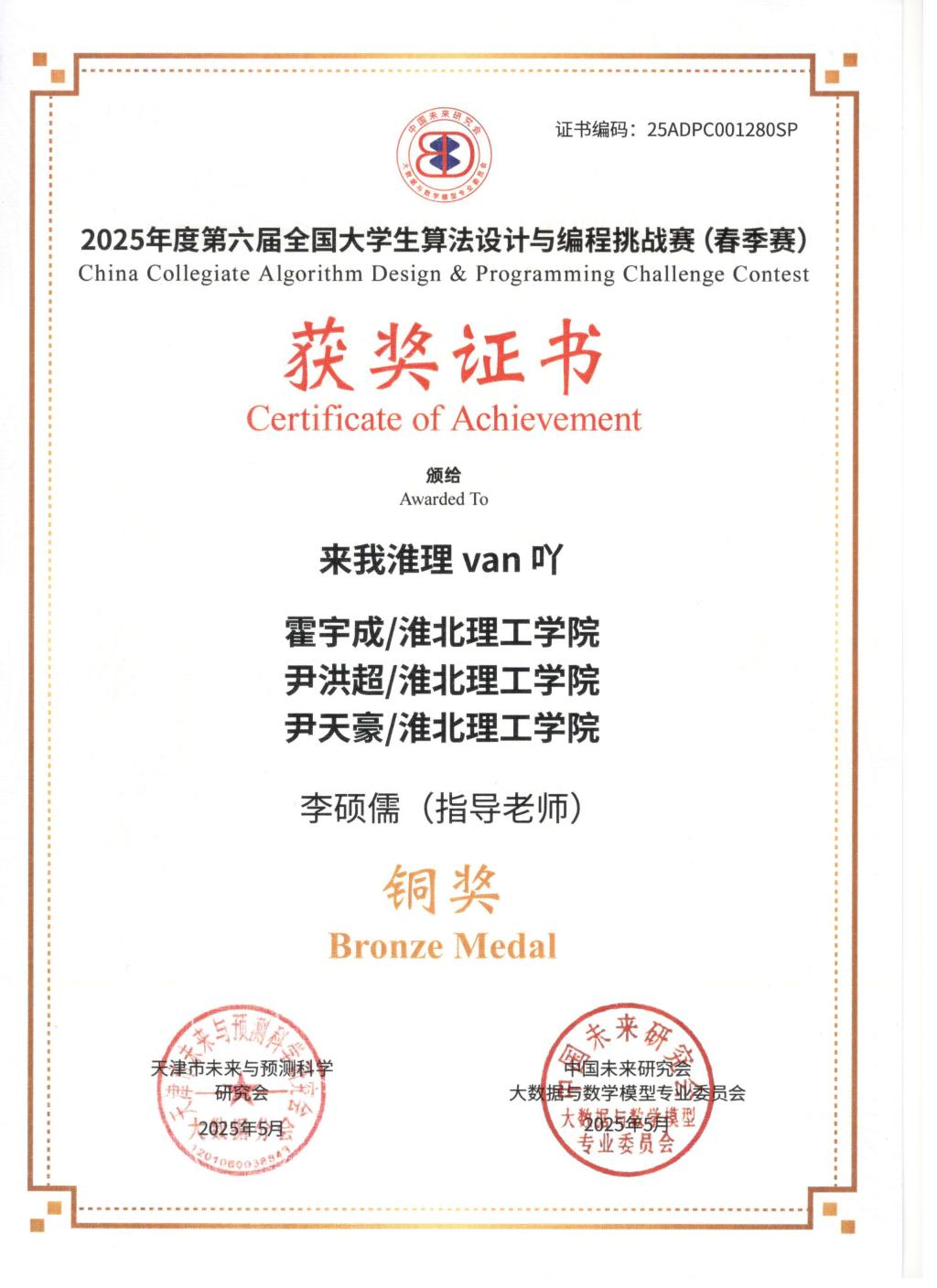 以赛促学强能力,算法竞技展锋芒。我校太阳成集团tyc522cc学子凭借扎实专业功底,获2025年度第六届全国大学生算法设计与编程挑战赛(春季赛)全国铜奖、获2025年安徽省机器人大赛——程序设计赛道省级二等奖、获2025年中国大学生程序设计竞赛全国邀请赛(郑州)全国铜奖。