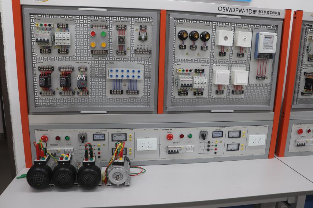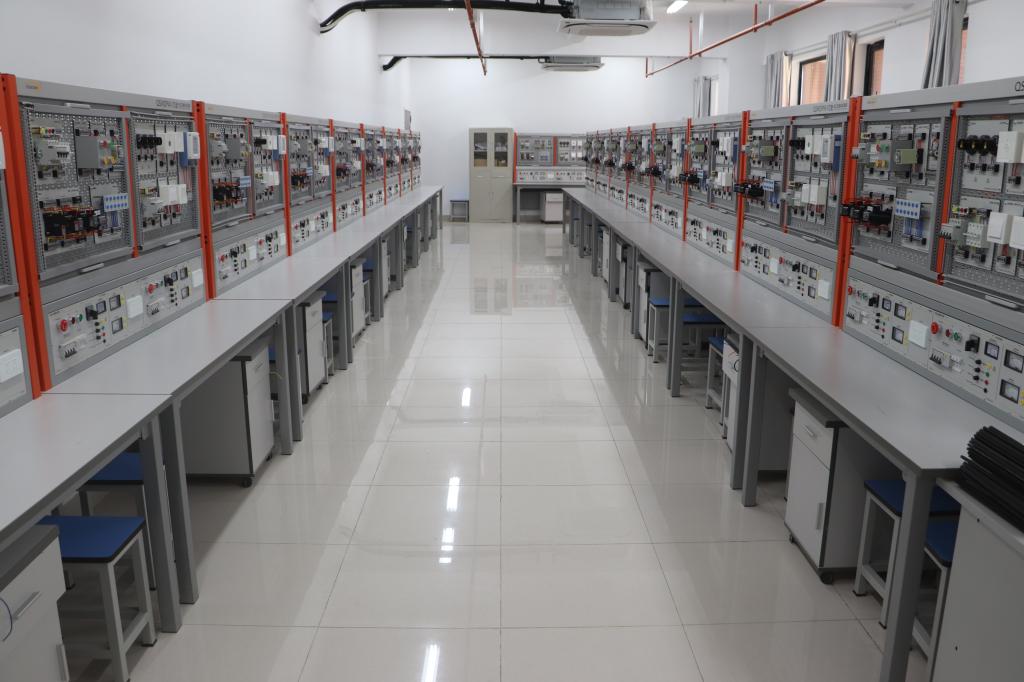 电工实训室建于2024年,占地面积126平方米,是一个基于电气安全规范与工业控制技术的基础操作平台,通过对学习电工材料、工具与仪表,室内外布线与室内照明,低压电器与电气控制系统等的学习,让学生掌握电工工具使用、电气图纸识读与工业设备电气维护的核心技能,培养学生具备安全操作认证要求的电气系统安装与检修能力,为学生在自动化设备运维、楼宇智能控制等方向的职业技能发展提供场景化训练支撑。