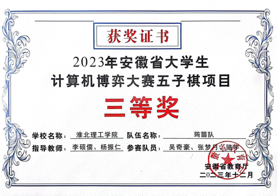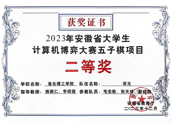 近日,安徽省大学生计算机博弈大赛(安徽省大学生学科和技能竞赛B类项目)在安徽大学举办,我校太阳成集团tyc522cc计算机科学与技术专业学生首次参加此项比赛,取得二等奖1项、三等奖1项的好成绩。